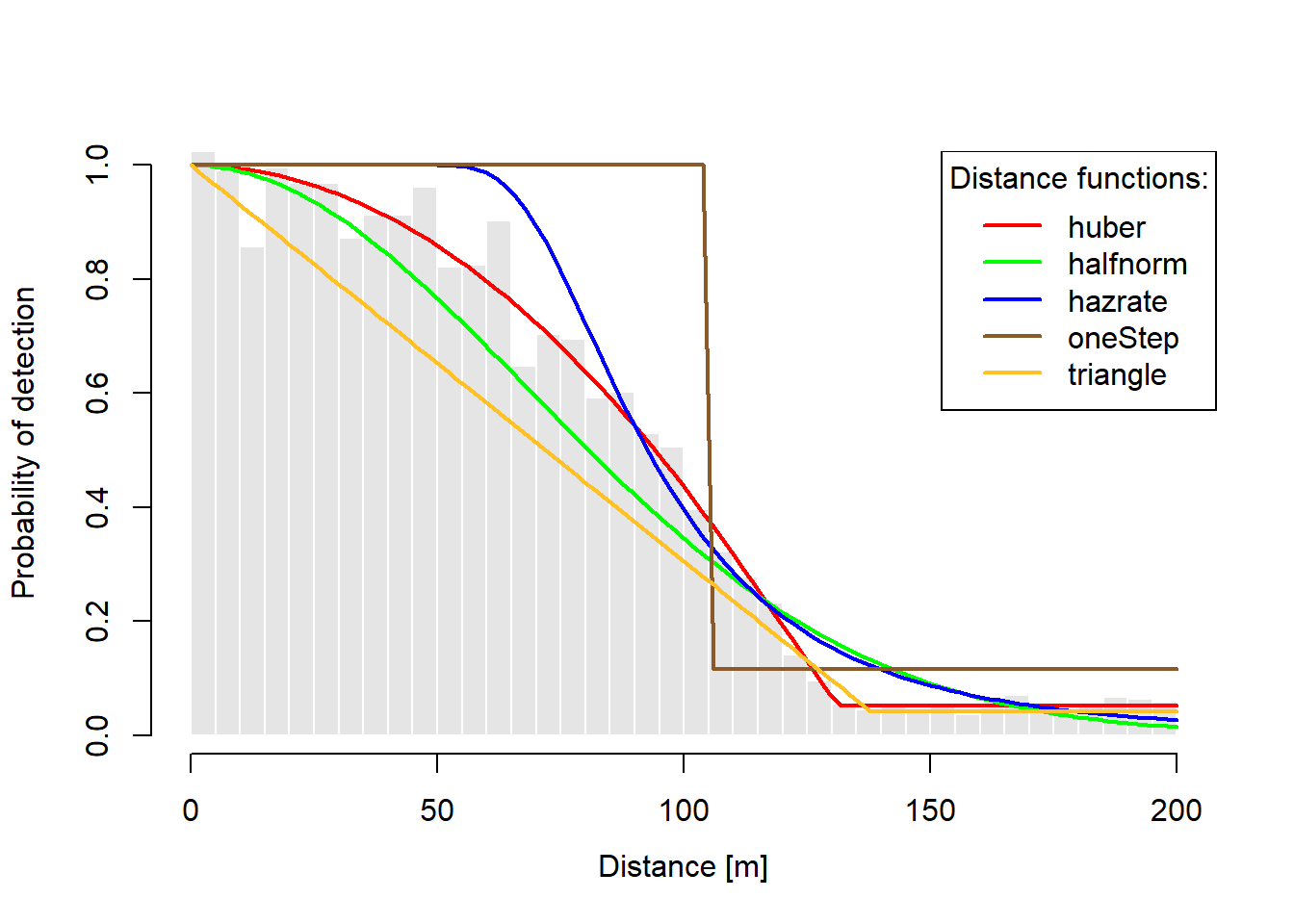The Huber distance function is flexible and has several characteristics we want in distance functions. For example, the derivative of the Huber distance function is zero at zero, which means the function is technically horizontal at the x intercept (= distance 0). This characteristic matches the half normal, hazard rate, and oneStep distance functions. The Huber distance function has a ‘shoulder’ similar to the half normal function. Huber’s ‘shoulder’ is quadratic in shape, while the half normal’s is exponentially quadratic. Huber’s ‘shoulder’ does not (cannot) extend as far as the hazard rate function’s and this is an important difference. Perhaps Huber’s most useful characteristic is the uniform distribution mixed in to model large distances. This mixture process means that a ‘small trickle’ of large distance values do not cause instability, and right-truncating a small fraction is not necessary.